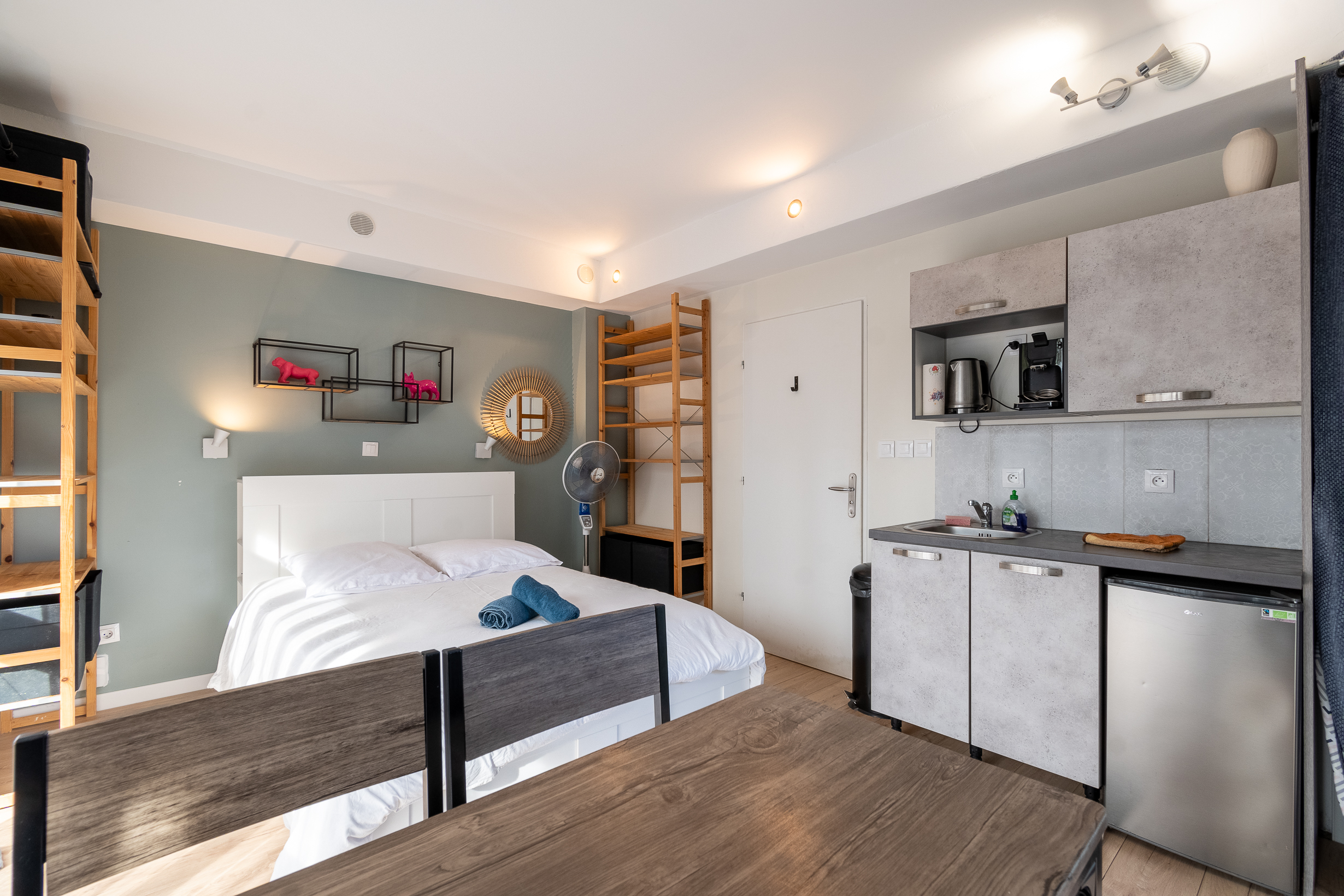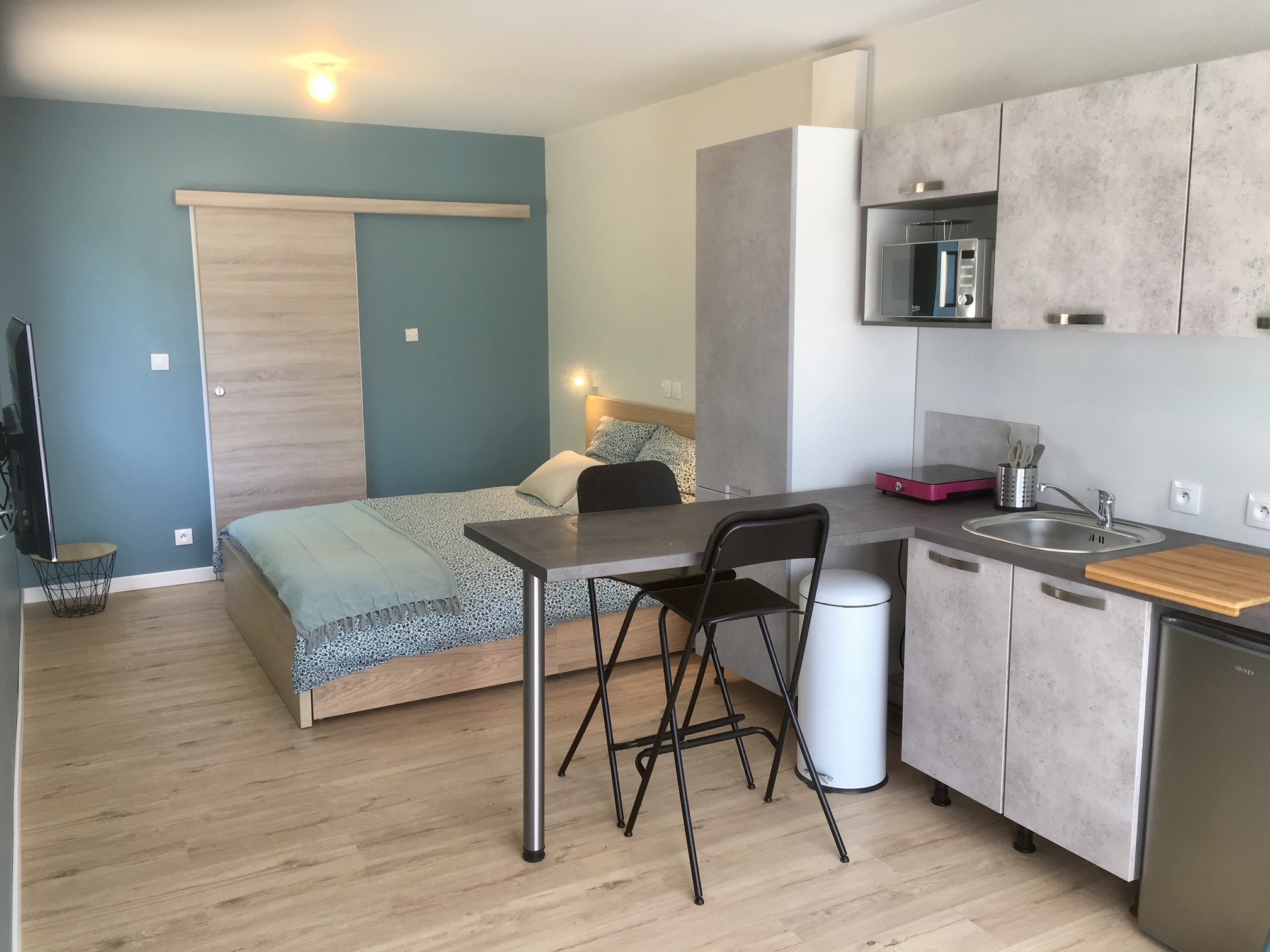 Nos studios de 25 pour 1 à 2 adultes et 1 ou 2 enfants ou 1 adulte avec lit double de 160 cm, TV connectée, kitchinette et salle d'eau, petit canapé lit de 120cm