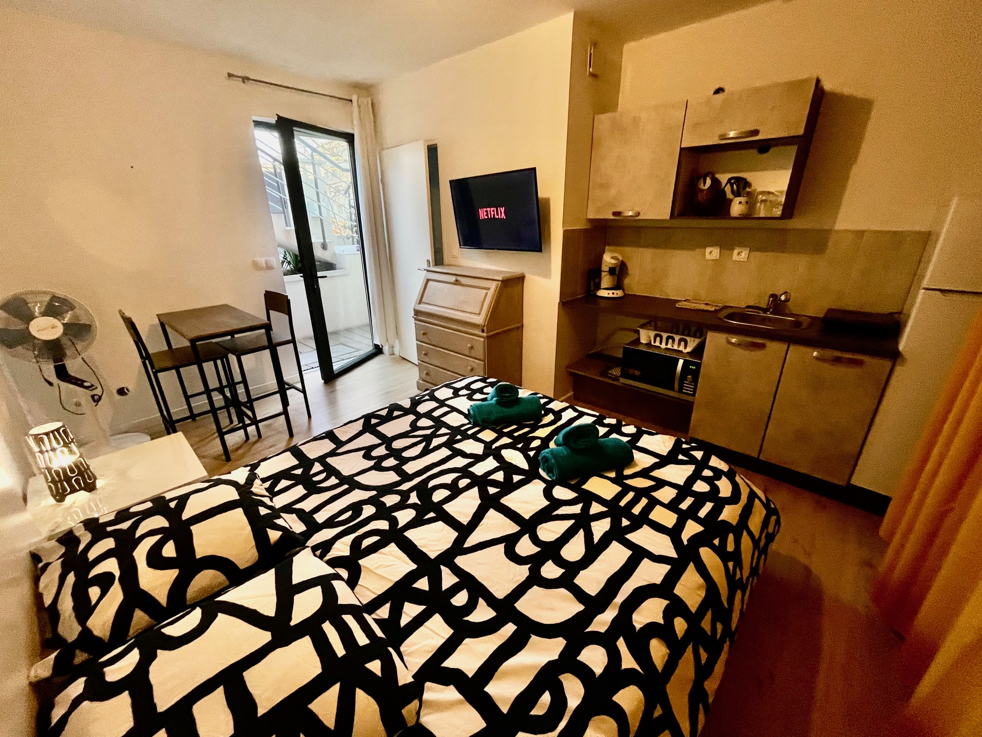 Nos studios de 19 m2 pour 1 à 2 personnes avec lit double, TV connectée, kitchinette et salle d'eau, terrasse et jardin